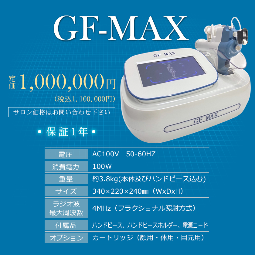 頭金ゼロでも分割払でGF-MAXが導入できる!今やSNSが情報格差を無くし、全国どこのエリアでも消費者は『韓国エステを体験してみたい』と身近なエステサロンを探しています。資金が貯まるまで機械の購入を待っていたら他社に市場をおさえられます!だれよりも先に地域一番店としてGF-MAX導入の名乗りを上げる事で先行者メリットを享受できます。